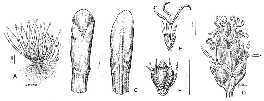 A. Planta. B. C. Ápipce de la vaina, cara ventral y dorsal, respectivamente. D. Espiguilla. E. Flor. F. Aquenio.