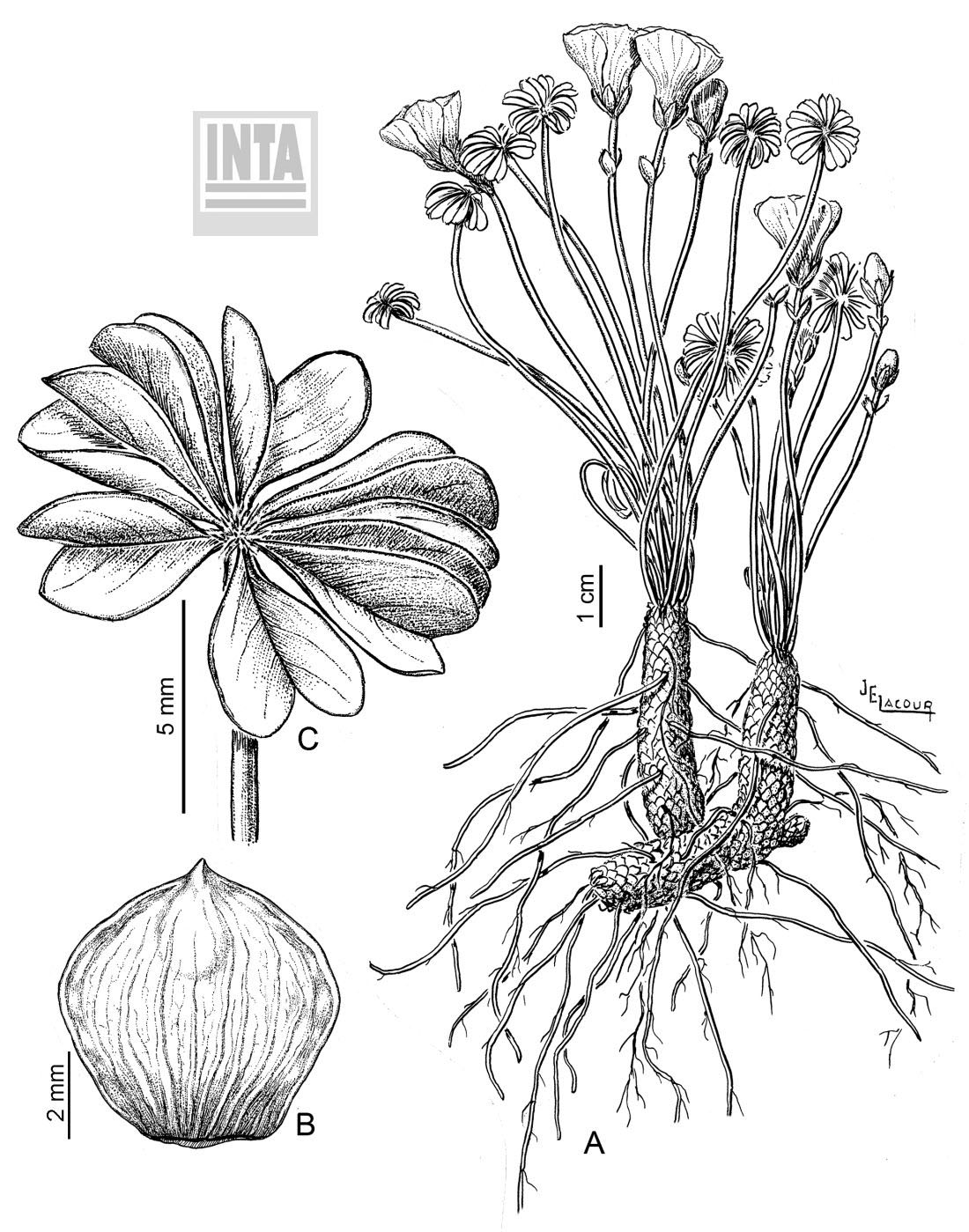 Hierbas acaules, perennes, de 3,5-19 cm de alto. Raíces adventicias, fibrosas; rizomas horizontales, cilíndricos, delgados, enangostados cada 1-2 cm; escamas nutricias triangulares o rómbicas, hasta de 5,5 × 5 mm, imbricadas espiraladamente, castaño-rojizas, carnosas, suculentas, de sección sub-planoconvexa, mácula anaranjada a veces presente. Hojas 2-7; estípulas hasta de 5 × 2,5 mm, adnatas al pecíolo, glabras o con pelos glandulares simples, cortos; pecíolos hasta de 3,5-19 cm de largo, glabros; folíolos 5-12, obcordados, de 22-3,5 × 22-3,5 mm, verdosos, glaucos, a veces con los márgenes rojizos, incisos 1/ 6-1/4, desiguales, glabros o laxamente ciliados. Cimas 1-floras; pedúnculos más largos o iguales que el follaje, glabros; brácteas ovadas, hasta de 5 × 2,5 mm, opuestas, amplexicaules, hialinas; pedicelos de 10-20 mm de largo, glabros. Flores hasta de 60 mm de diámetro; sépalos agudos o subagudos, de 12 × 5 mm, verdes o rojizos, glabros o enteramente pubescentes; calli a veces presentes; pétalos 3-5 veces el largo de los sépalos, unguiculados, rosados a violáceos, a veces con líneas y garganta violácea. Cápsulas globosas, de 6-7 mm de diámetro, glabras o con pelos cortos, simples o con pelos glandulares; carpelos con el interior pubescente, con 1-2 semillas. Semillas elipsoides, de 2 × 1 mm, asimétricas, costadas, ocres.
