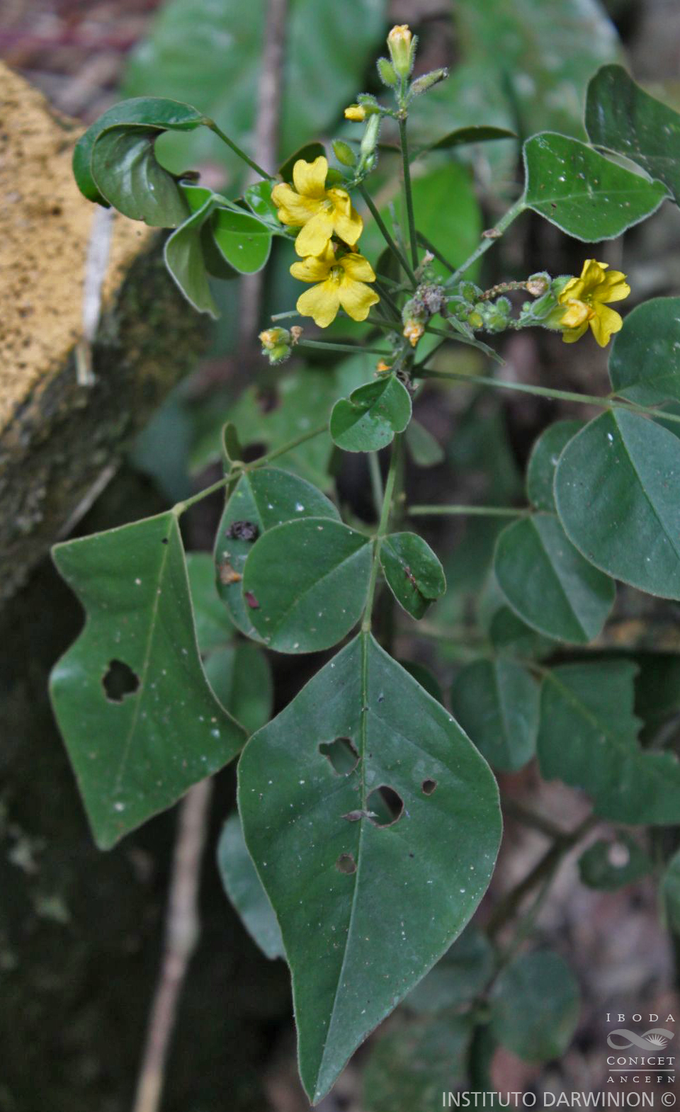 Subarbustos hasta de 1,5 m de alto, ramificados, con pubescencia adpresa. Rizomas hasta de 6 mm de diámetro. Tallos subleñosos, hasta de 5 mm de diámetro, raro ramificados; entrenudos de 1-2,5 cm a casi nulos hacia el ápice. Hojas numerosas; pecíolos hasta de 8 cm de alto, canaliculados, ensanchados en la base, pubescentes; peciólulos hasta de 2 mm de largo, gruesos, hirsuto-pilosos; folíolos 3, membranáceos, discolores, a veces envés violáceo, el central rómbeo-ovado o elíptico-acuminado, de 35-125 × 22-70 mm, los laterales asimétricos, de 20-65 × 13-35 mm; pubescencia corta, generalmente curva, esparcida sobre ambas caras, más abundante sobre las nervaduras; borde densamente ciliado; nervadura media impresa en la haz, prominente en el envés, base redondeada o más o menos cuneada. Cimas bífidas, 9-45-floras, umbeliformes, menores que las hojas; pedúnculos hasta de 7 cm de largo, pubescentes, a veces con pelos glandulares; brácteas hasta de 1 mm de largo; bractéolas ovado-acuminadas, pilosas y a veces glandulosas. Flores hasta de 20 mm de diámetro; sépalos verdosos, oblongos o lineares, hasta de 5 × 1,5 mm, pubescentes, con borde hialino; pétalos obovadosubespatulados, retusos, amarillos. Cápsulas subglobosas, hasta de 4 mm de diámetro, más cortas que el cáliz, glabras. Semillas 1 por carpelo, semi-ovoideas, asimétricas, costadas, ocres, con estrías transversales, fóveas en las depresiones poligonales, superficie verrucosa.