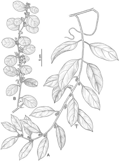 Sufrútice voluble hasta de 20 m de largo; tallos cilíndricos, pilosos a glabros. Hojas ovadas a anchamente ovadas u obovadas, de 3-9,4 × 1,4-5,8 cm, glabras a esparcidamente pubescentes, en particular sobre los nervios en la cara adaxial, el margen entero, ocasionalmente ondulado, base redondeada, ápice redondeado a retuso y apiculado; pecíolos de 0,4-1,8 cm de largo, usualmente pilosos. Inflorescencias estaminadas axilares, solitarias o agrupadas, filiformes a abiertas, vilosas; pedúnculo de 0,3-0,9 cm de largo; brácteas lanceoladas, de 0,7-0,9 × ca. 0,3 mm; bractéolas ovado-lanceoladas, de 0,4-0,6 × 0,2-0,4 mm, vilosas. Inflorescencias pistiladas racemosas, axilares. Flores amarillo-verdosas; sépalos 6 en 2 series, los exteriores angostamente ovado-lanceolados, de 1,1-1,3 × 0,6-0,8 mm, esparcidamente vilosos, los interiores elípticos a anchamente ovados, ca. 2 × 6 mm, vilosos; pétalos en 2 series similares, obovados, de 1,1-1,3 × 0,6-0,7 mm, glabros; estambres 6, filamentos de 1 mm de largo. Fruto obovoide, de 10-14 × 6,8-7,9 mm, ápice redondeado; pedúnculos fructíferos de 1 cm o más largos.